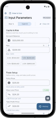 ✔️ Cash $ Mode → calculate position size from a fixed cash risk amount + stop loss.