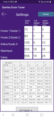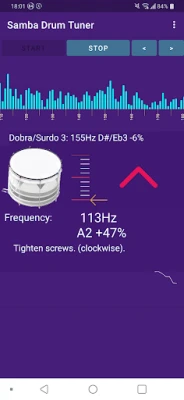 This will show the loudest frequency detected and an icon indicating whether to tune up or down. A green tick indicates it is correctly tuned, green up or down arrow indicates the drum is close, red arrows indicate it is further out. There is also a full range frequency detector.